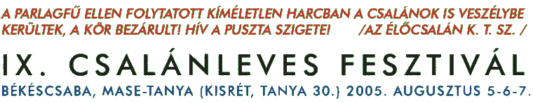 Megérkeztek az első képek a 2005-ös Csalánlevesről. A fotók bemutatják az egész fesztivált az előkészületektől a zárókoncertig. A galéria megtekinthető a CSABANET-en az alábbi linkre kattintva: Csalánleves 2005 - az első képek